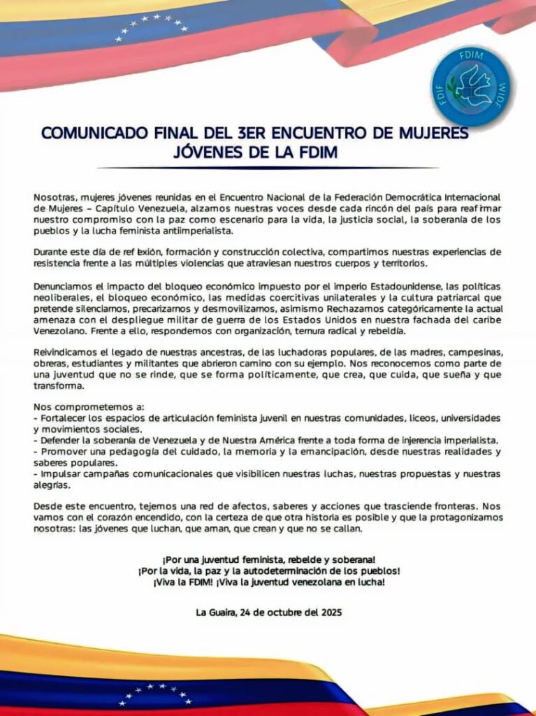(Caracas, 24-10-2025. Prensa MinMujer).- Con una firme declaración de compromiso por la paz, la justicia social y la emancipación de las mujeres, culminó el Tercer Encuentro de Mujeres Jóvenes de la Federación Democrática Internacional de Mujeres (FDIM), Capítulo Venezuela, espacio de reflexión, formación y construcción colectiva que reunió a jóvenes de diversas regiones del país.